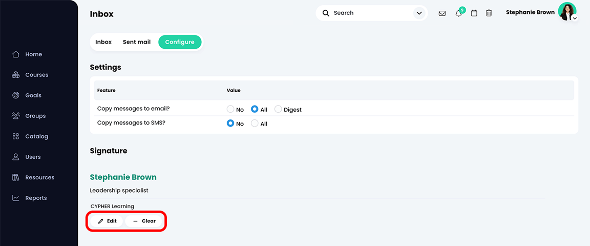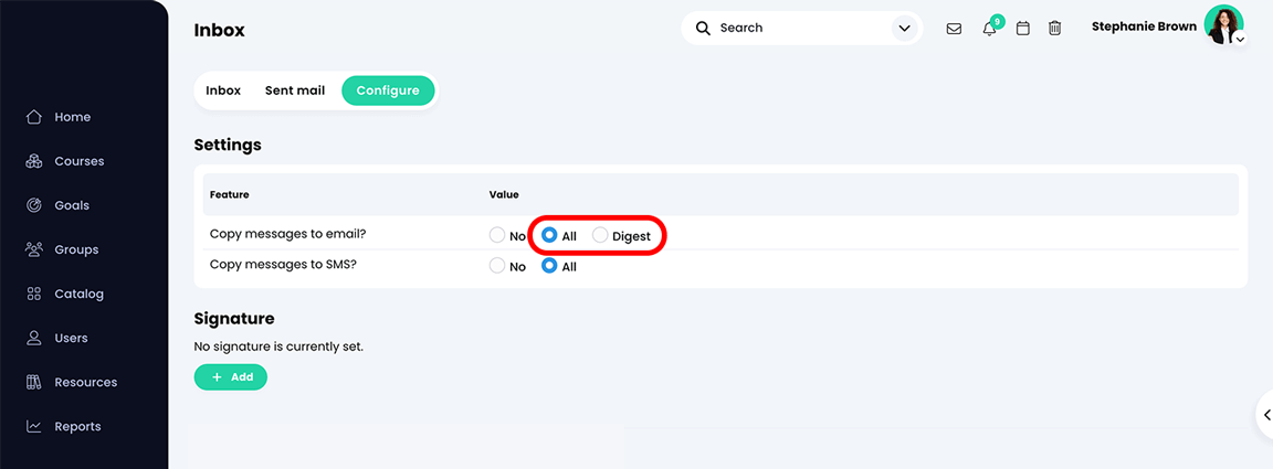 إذا كانت هذه الميزة مُفعّلة على منصتك، يمكنك طلب إرسال نسخ من الرسائل إلى بريدك الإلكتروني و/أو عنوان رسائلك النصية. يمكن نسخ الرسائل بشكل منفصل أو دمجها في رسالة "ملخص" واحدة تُرسل مرة واحدة يوميًا.