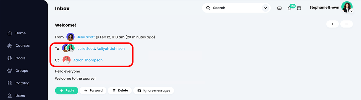 إذا أرسل لك مستخدم رسالة من دورة معينة، فإن حقل "من" يعرض أيضًا رابطًا للدورة المرتبطة.