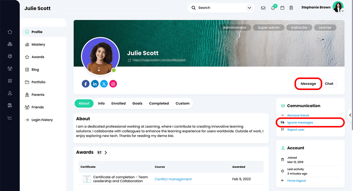 نظام المراسلة آمن ويضمن عدم تلقي الأعضاء رسائل غير مصرح بها. على سبيل المثال، إذا اختارت مدرسة ما أن تكون "مجتمعًا مغلقًا"، فلن يتمكن طلابها من تلقي الرسائل إلا من أولياء أمورهم وأعضاء آخرين في المدرسة.