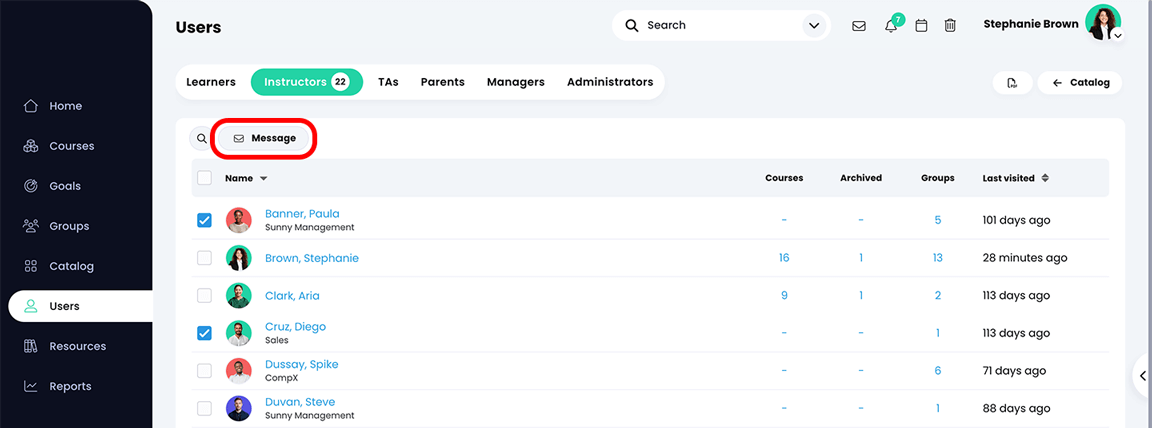 - امنع تبادل الرسائل بين المتعلمين إذا كانوا في ساعات الدورة التدريبية وكان تكوين الدورة يمنع ذلك.