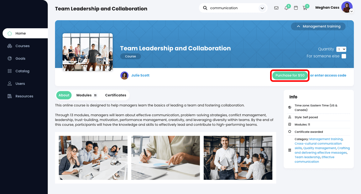 - After clicking a course or learning path, you can choose to enroll or purchase the course.